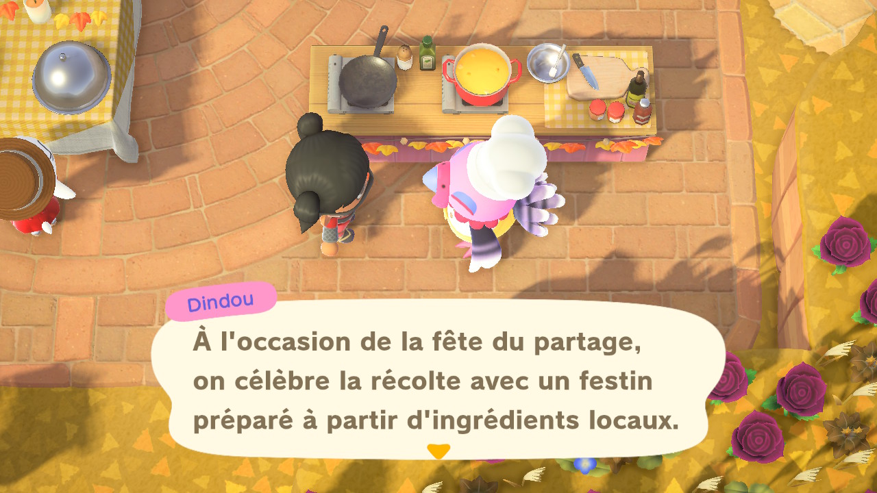 Pendant le jour du partage (26 novembre), qui fait référence à Thanksgiving, Dindou vous donnera des recettes et vous demandera de lui rapporter les ingrédients nécessaires. Ces derniers se trouvent sur votre île, et parfois, vos habitants peuvent vous les donner. En lui apportant les bons ingrédients, vous gagnerez les objets Jours du partage. De plus, ajoutant un ingrédient secret, vous aurez un plan de bricolage de la série Jour du Partage automatiquement. Si vous n’avez pas fait cet événement, pas de panique, vous pourrez acheter à la boutique Nook les plans que vous avez manqué.