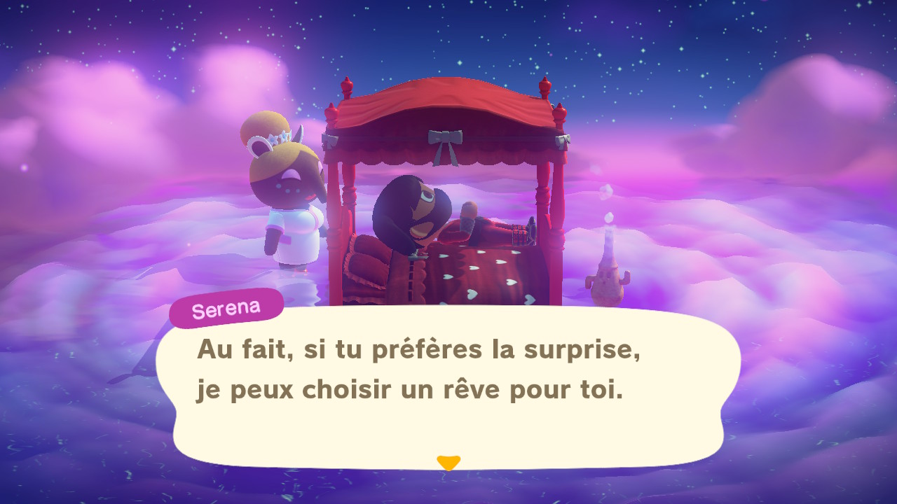 Les rêves de Séréna sont apparu pendant la mise à jour d’été. Ils permettent de voir les iles d’autres joueurs à travers le monde. Petit problème, il fallait absolument fournir un code, que l’on appelle code onirique dans le monde d’Animal Crossing, pour pouvoir découvrir une île. La mise à jour d’hiver remet en place les rêves automatiques : fini les codes écrits un peu partout ! En effet, dans le précédent opus, à savoir Animal Crossing : New Leaf, Serena pouvait déjà choisir aléatoirement les rêves en fonction de votre avancement dans le jeu.